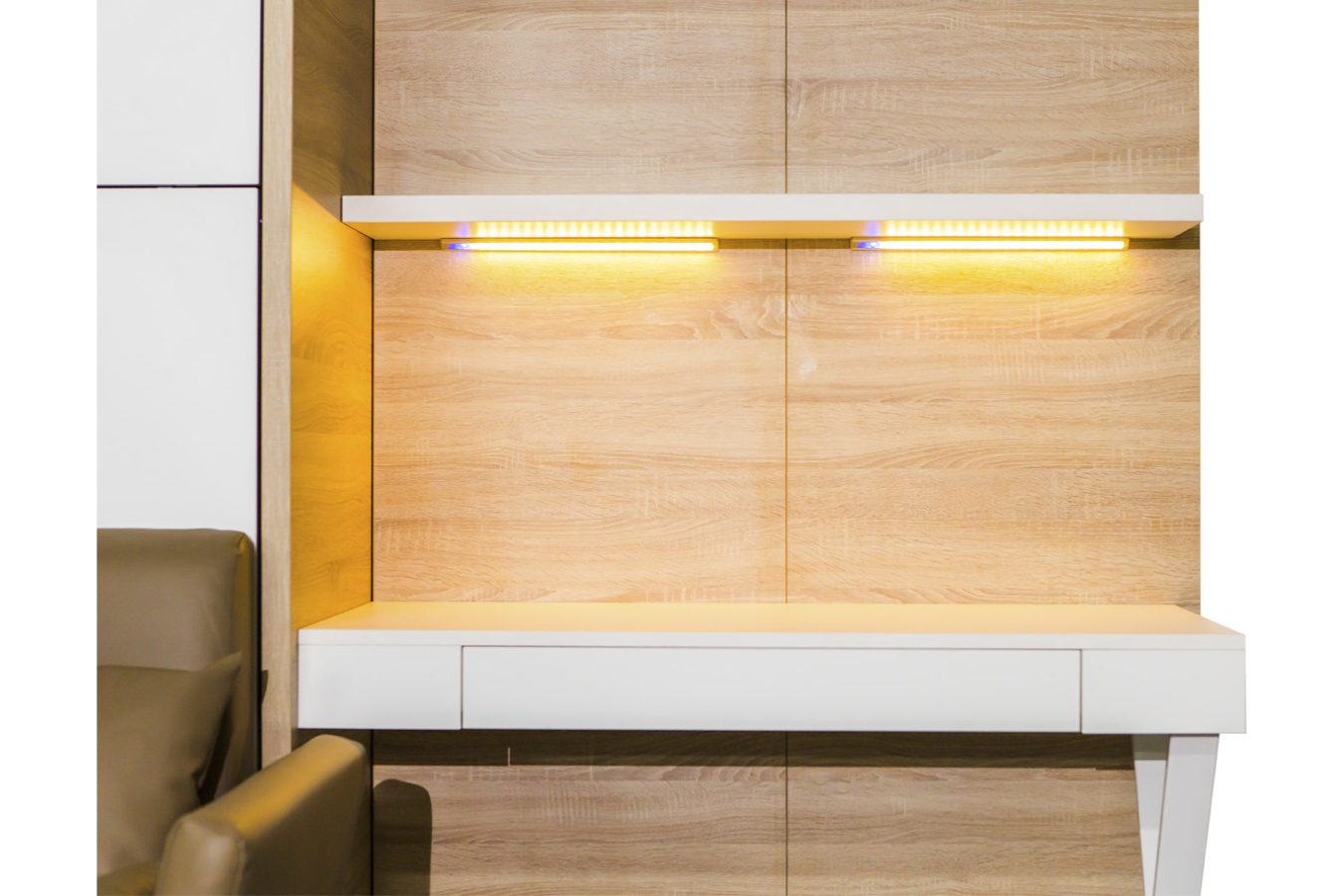 - Für jeden multifunktionell eingerichteten Raum bietet die platzeffiziente und gestalterisch überlegene Kombination Wandbett mit Sofa WBS 1 Soft Office Vertikal die ultimative Lösung. Das hochmoderne Design fügt sich stilgerecht den räumlichen Kapazitäten und individuellen Anforderungen. Tagsüber werden das hochwertig gepolsterte Sofa, der angegliederte Schreibtisch mit zweckdienlicher Schublade und nützliche Regalelemente zum Arbeiten und Entspannen genutzt, abends kann ohne großen Aufwand das Zimmer in eine gemütliche Schlafoase umgewandelt werden. Der Aufklappmodus ist ganz einfach zu handhaben, denn nur durch ein leichtes Ziehen an den Griffen wird der regulierbare Federmechanismus aktiviert, der ein unkompliziertes Öffnen und Schließen des Wandbettes gewährleistet. Geschmackvoll ausgewählte Kopfpolster und LED Leuchten tragen essentiell zum harmonischen Wohlfühl- und Raumkomfort bei.